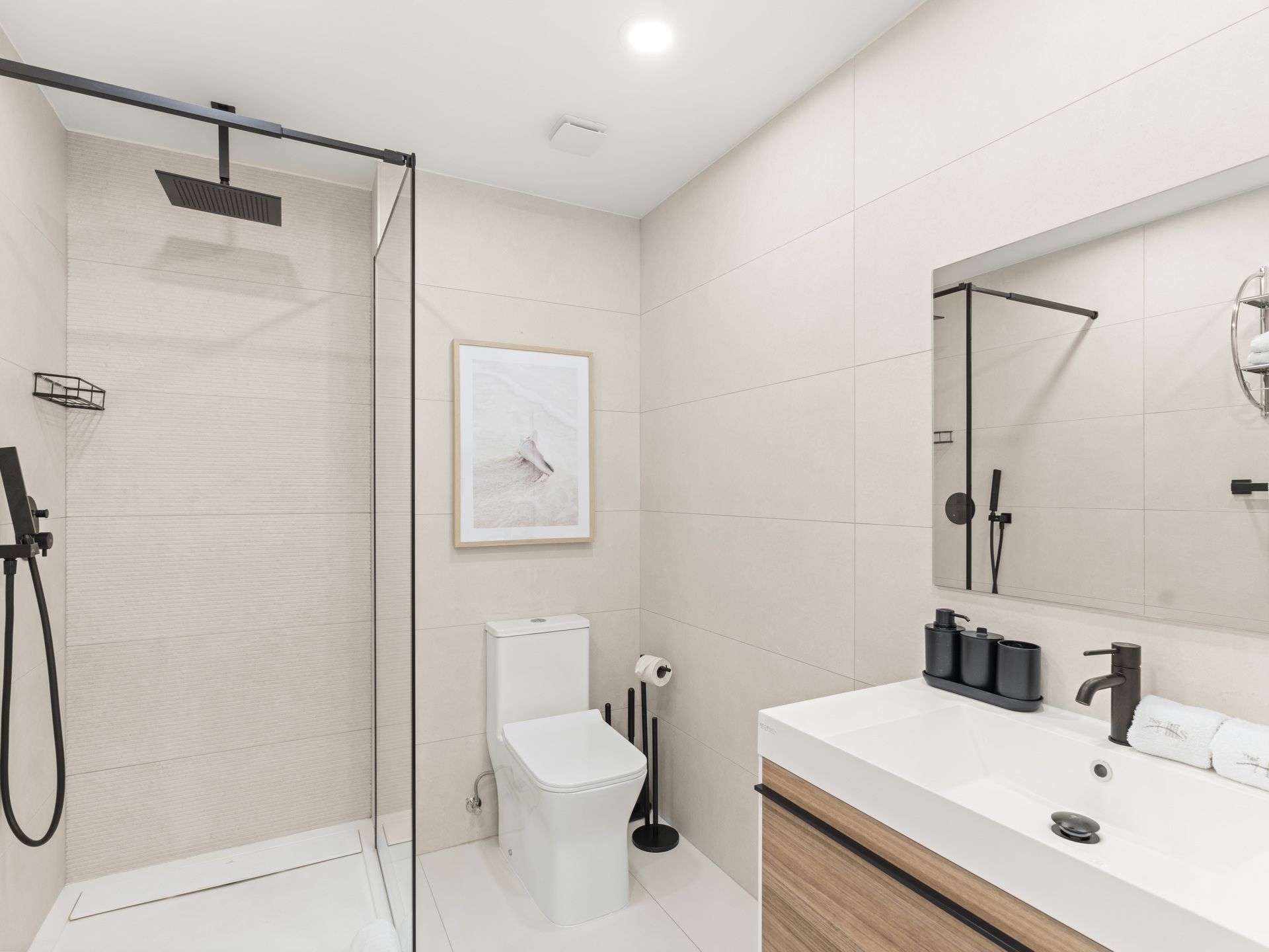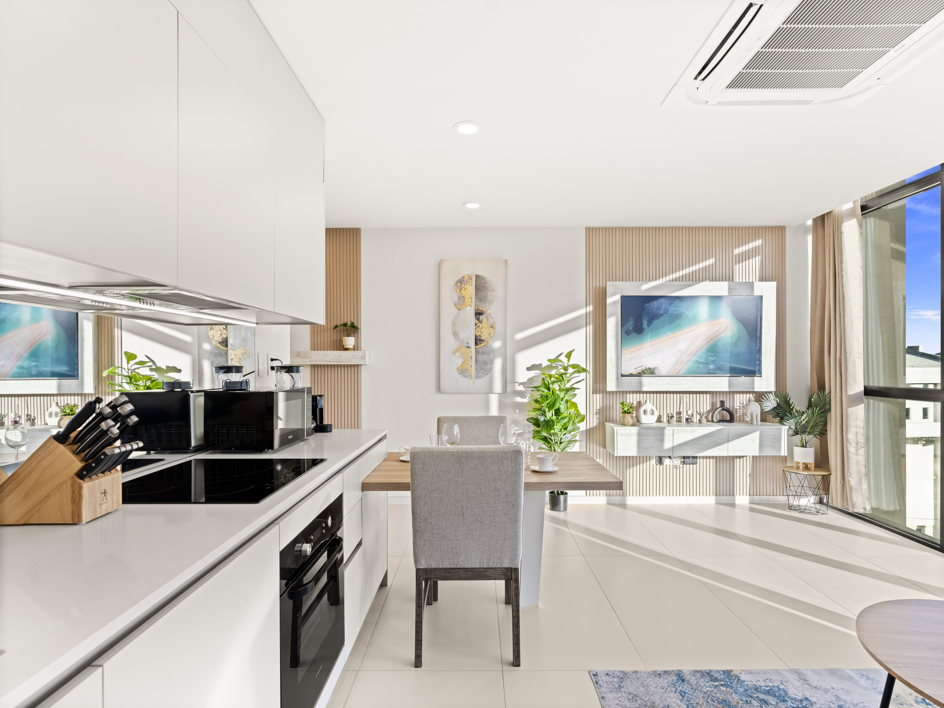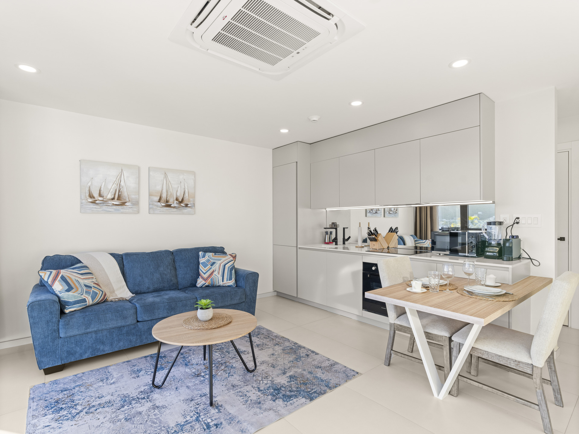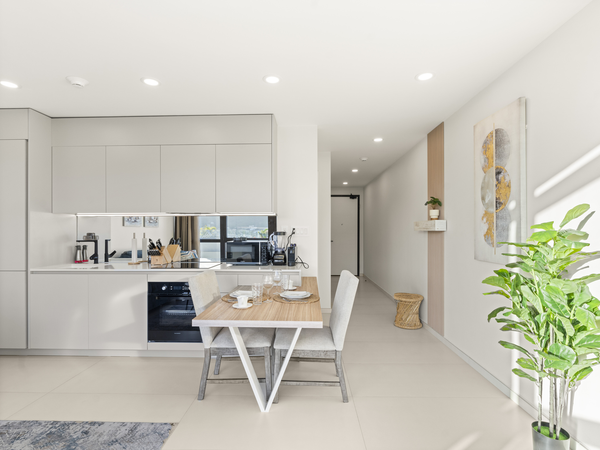 – Cuisine moderne entièrement équipée avec réfrigérateur, four, lave-vaisselle, grille-pain et machine Nespresso.