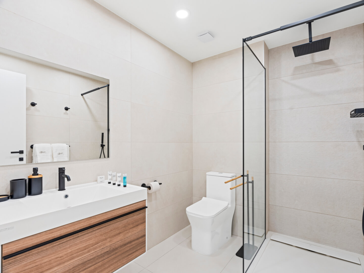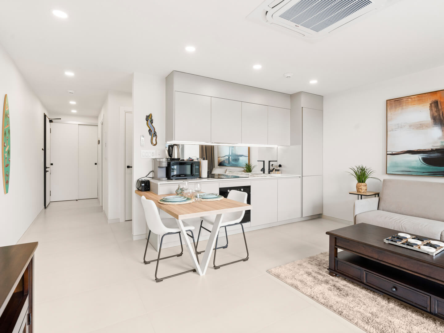 Le cœur de l’Appartement B-214 est sa cuisine bien équipée, conçue pour satisfaire tous vos besoins culinaires. Elle dispose d’appareils modernes, y compris une élégante machine à expresso pour votre café du matin, un lave-vaisselle pour faciliter le nettoyage et une machine à laver pour garder vos vêtements frais tout au long de votre séjour. Les passionnés de cuisine apprécieront la disposition pratique et l’espace de comptoir ample, rendant la préparation des repas agréable.