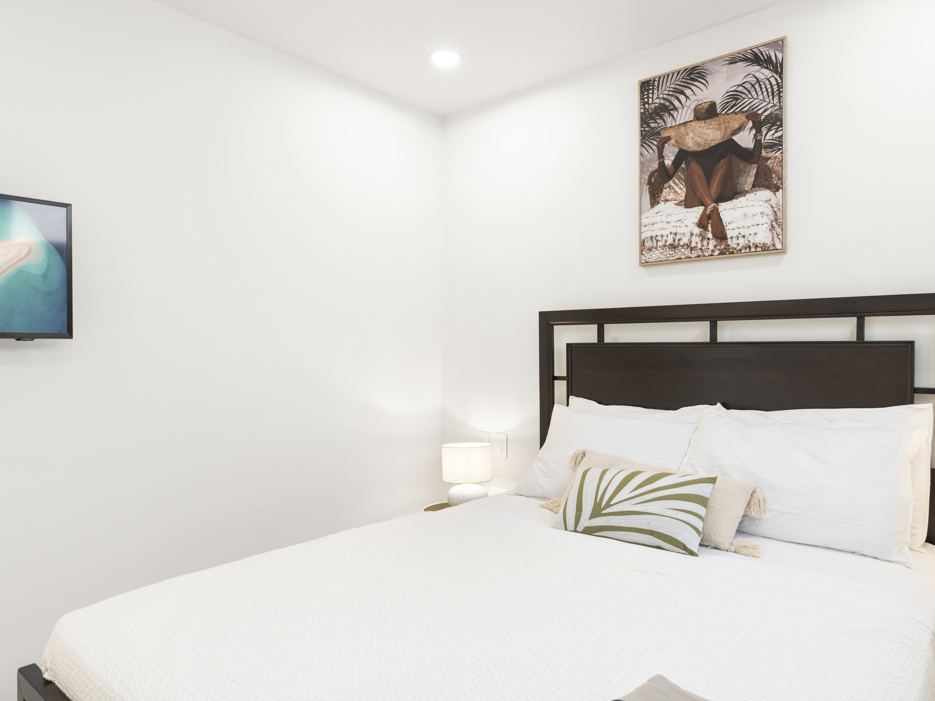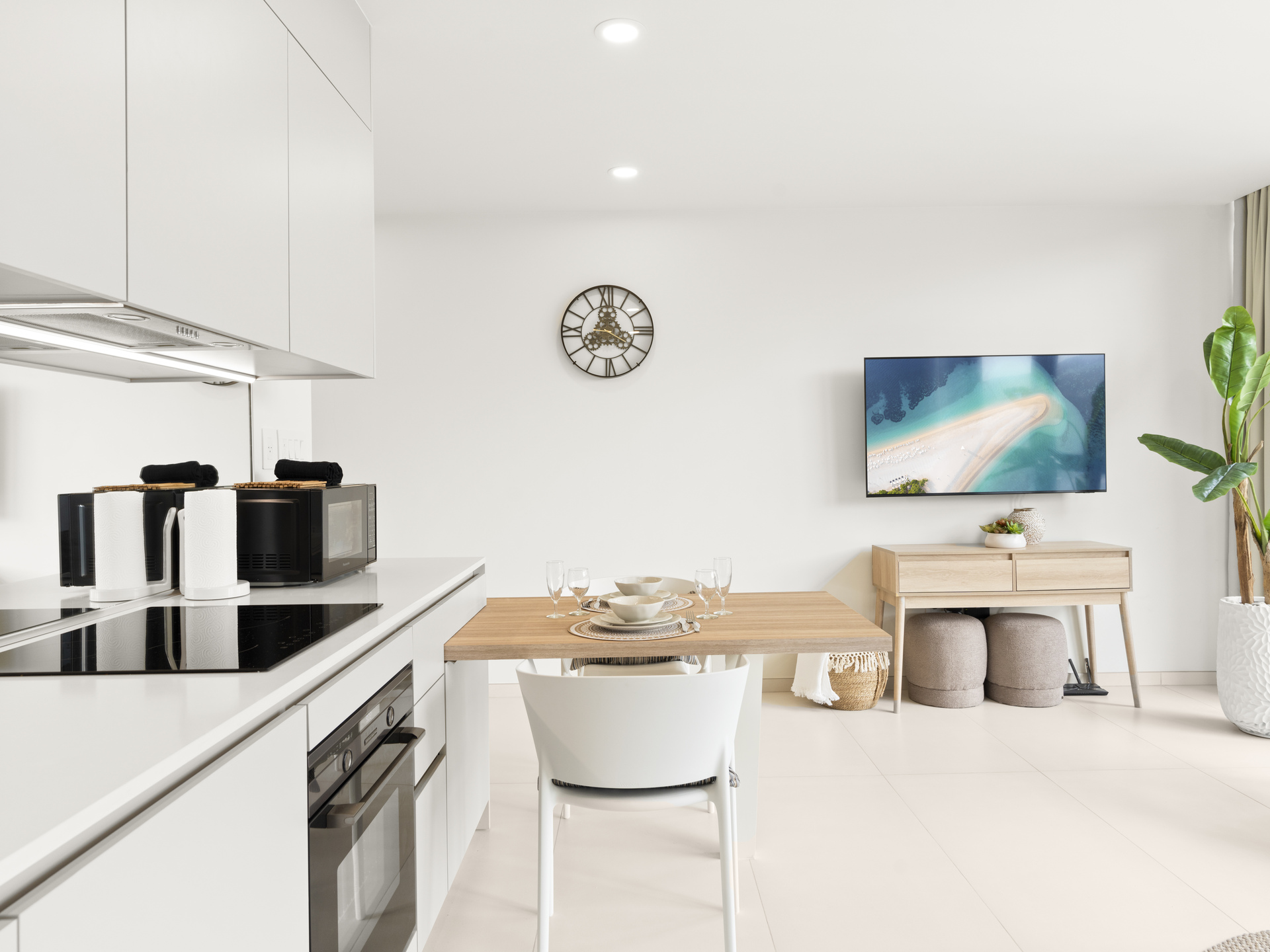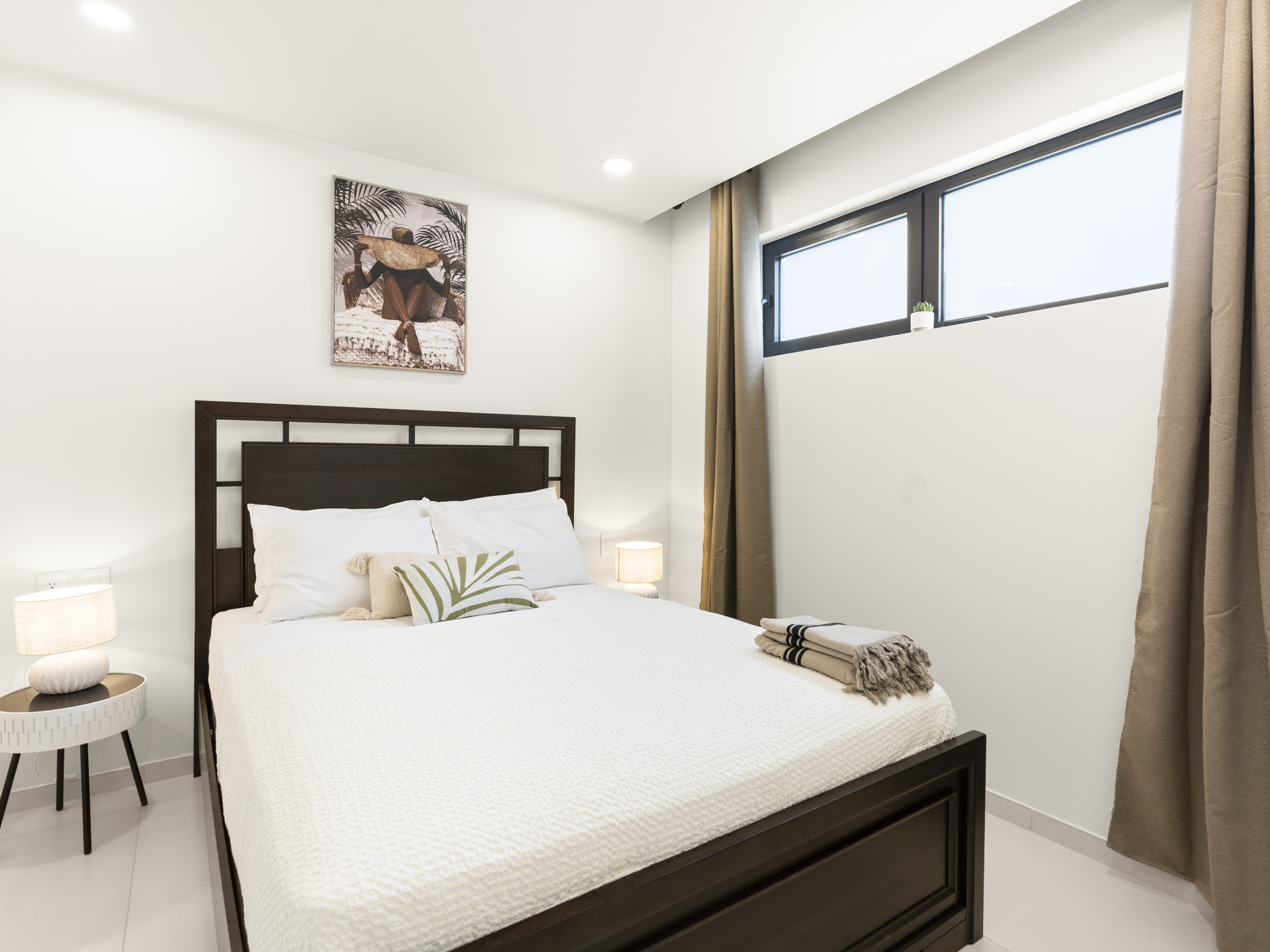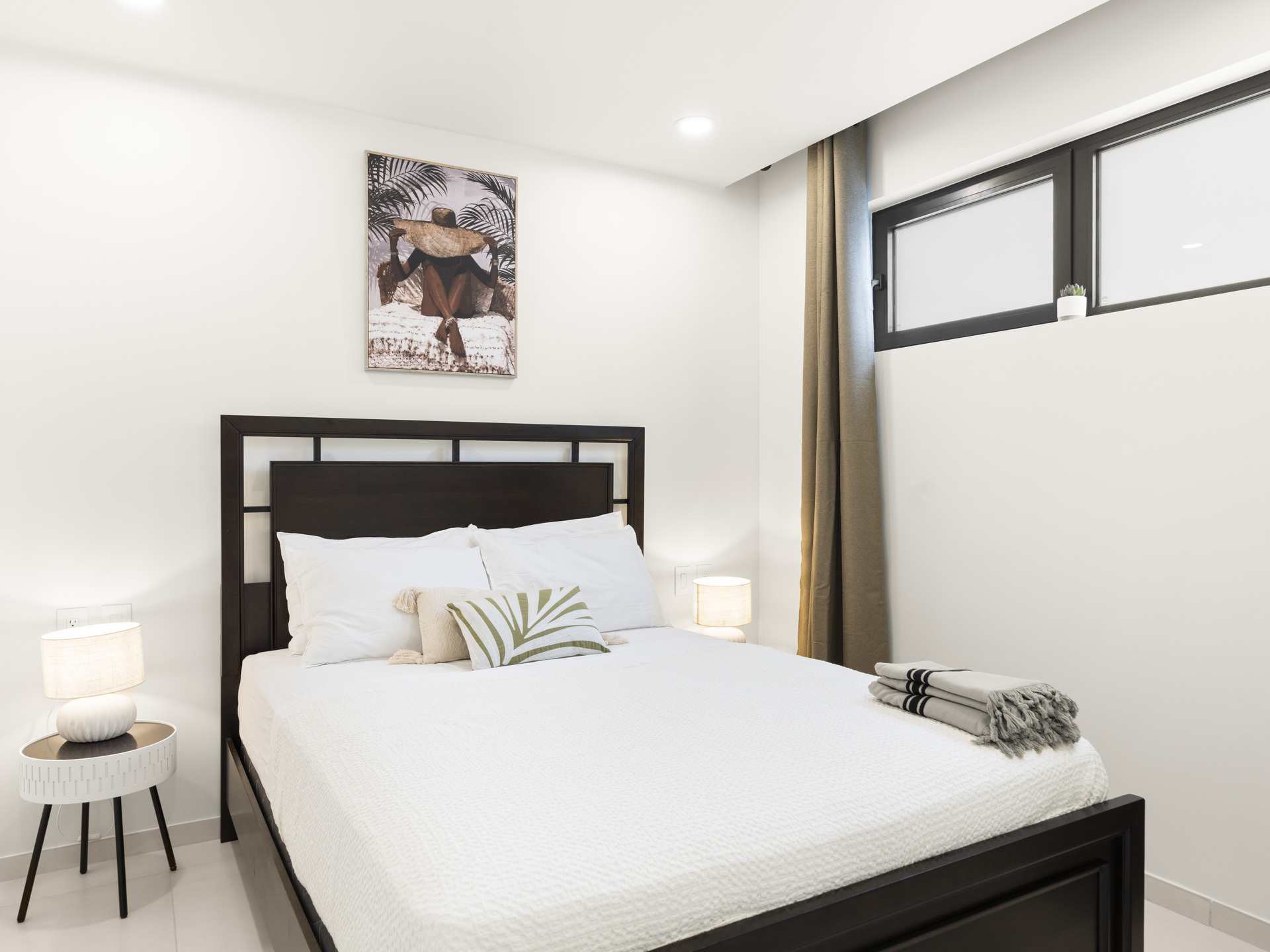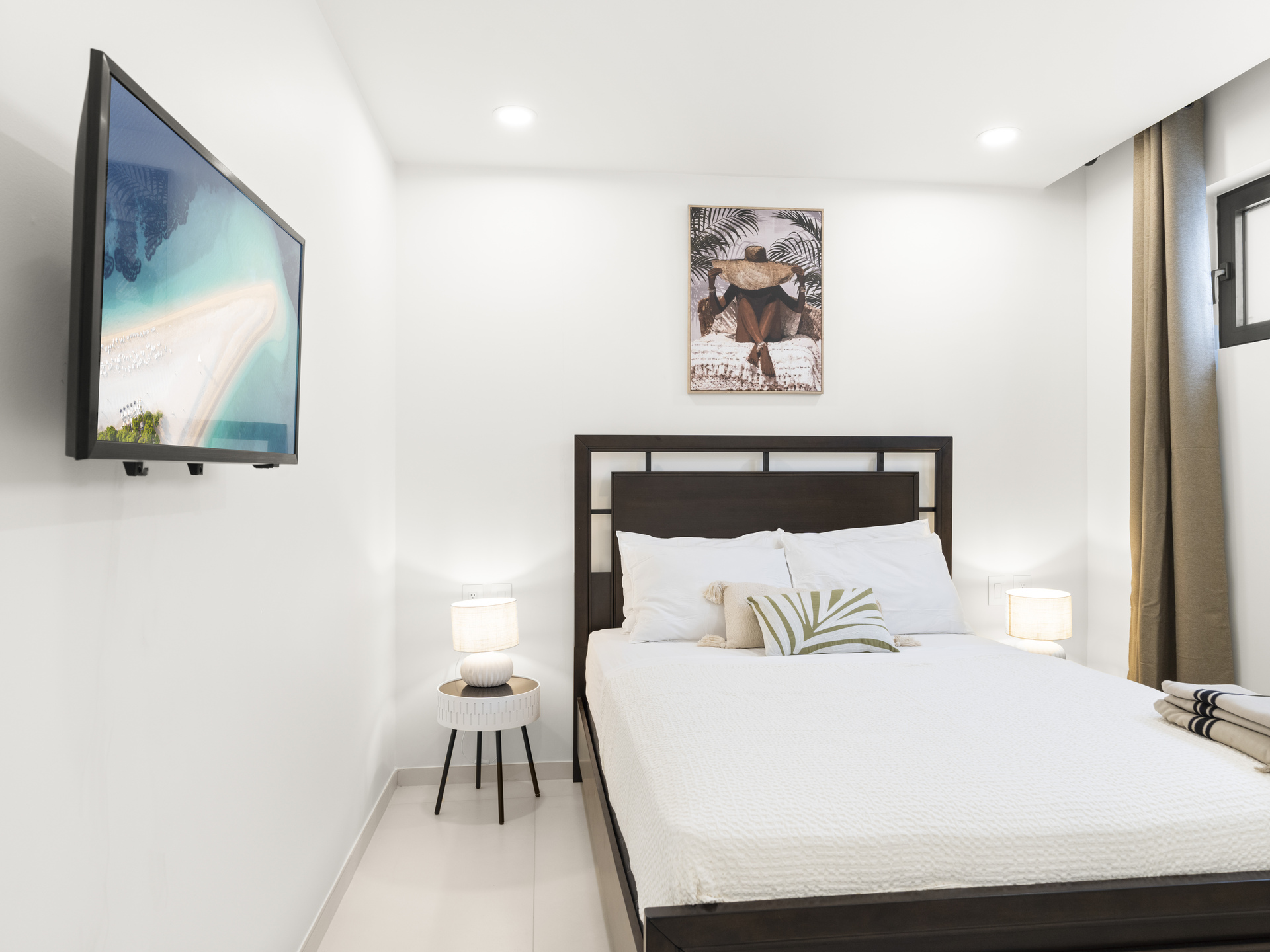 À l’intérieur, vous trouverez une chambre douillette, une salle de bain moderne et un salon confortable, idéal pour se détendre après une journée d’exploration de l’île. Les grandes fenêtres baignent l’appartement de lumière naturelle et vous permettent d’admirer la beauté du lagon de Simpson Bay depuis votre espace de vie.