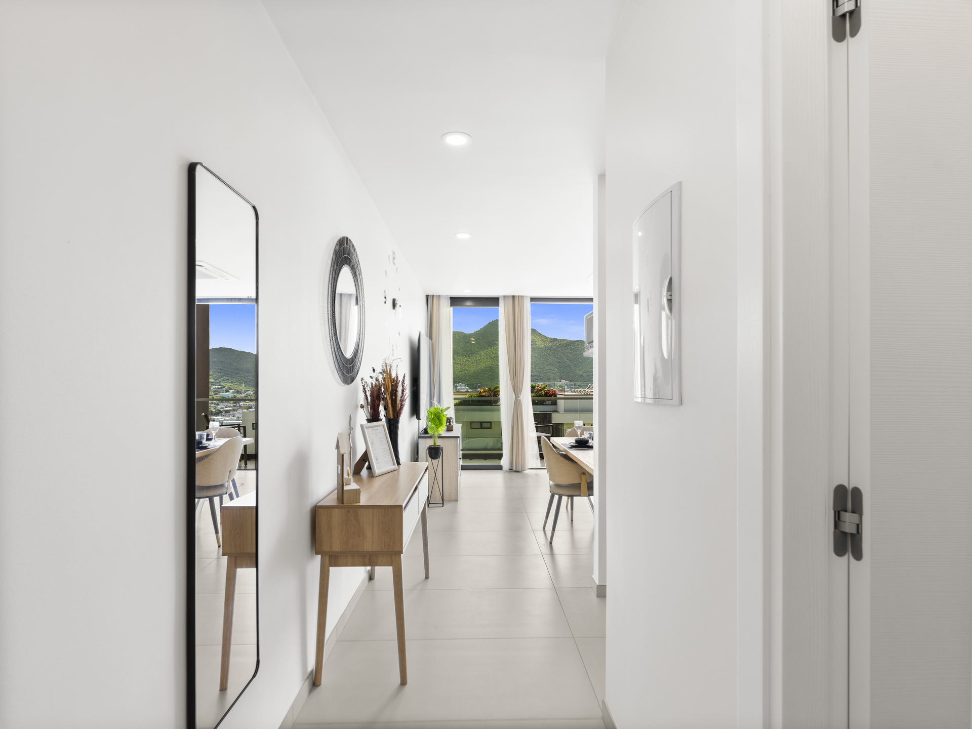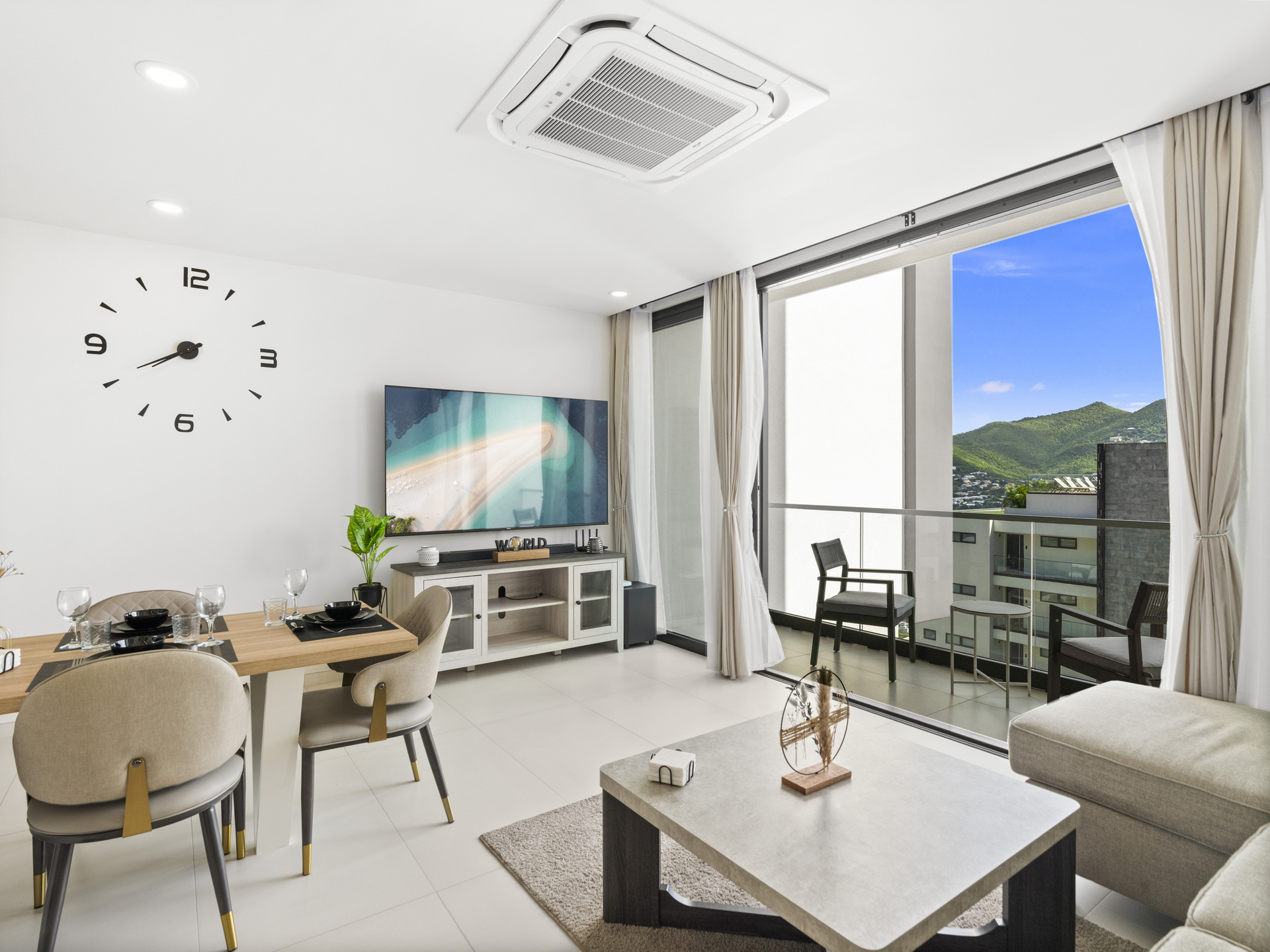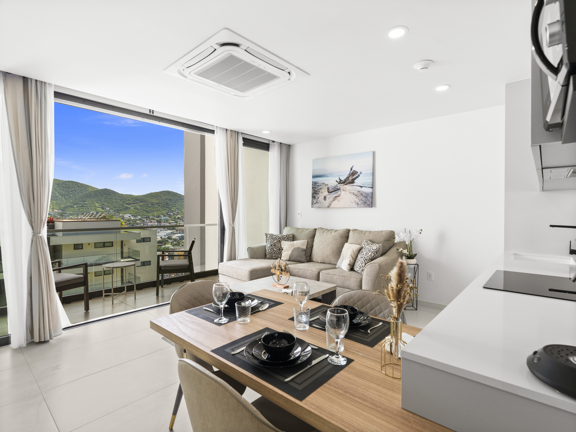 Découvrez l’appartement D414, une superbe suite d’une chambre et une salle de bain, située au premier étage du Bâtiment 4 de The Hills Residence. Élégant et accueillant, cet espace combine à merveille confort moderne et sérénité insulaire, parfait pour un couple ou un voyageur solo.