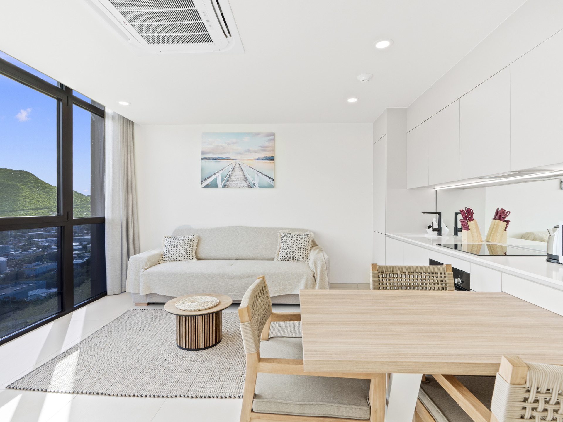 L’atout majeur de cet appartement réside dans ses larges baies vitrées , qui baignent l’intérieur de lumière naturelle et offrent une vue panoramique imprenable, laissant la beauté de l’extérieur pénétrer dans votre espace de vie. Le salon et la salle à manger ouverts sont soigneusement conçus avec un mobilier contemporain et une ambiance chaleureuse et accueillante, idéale pour se détendre et recevoir.