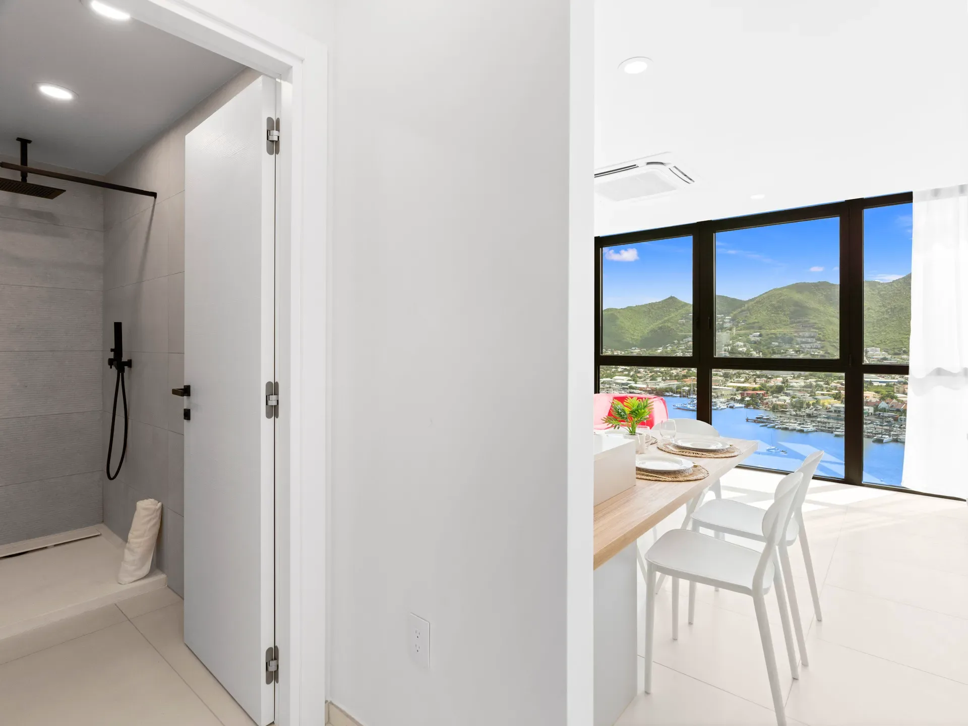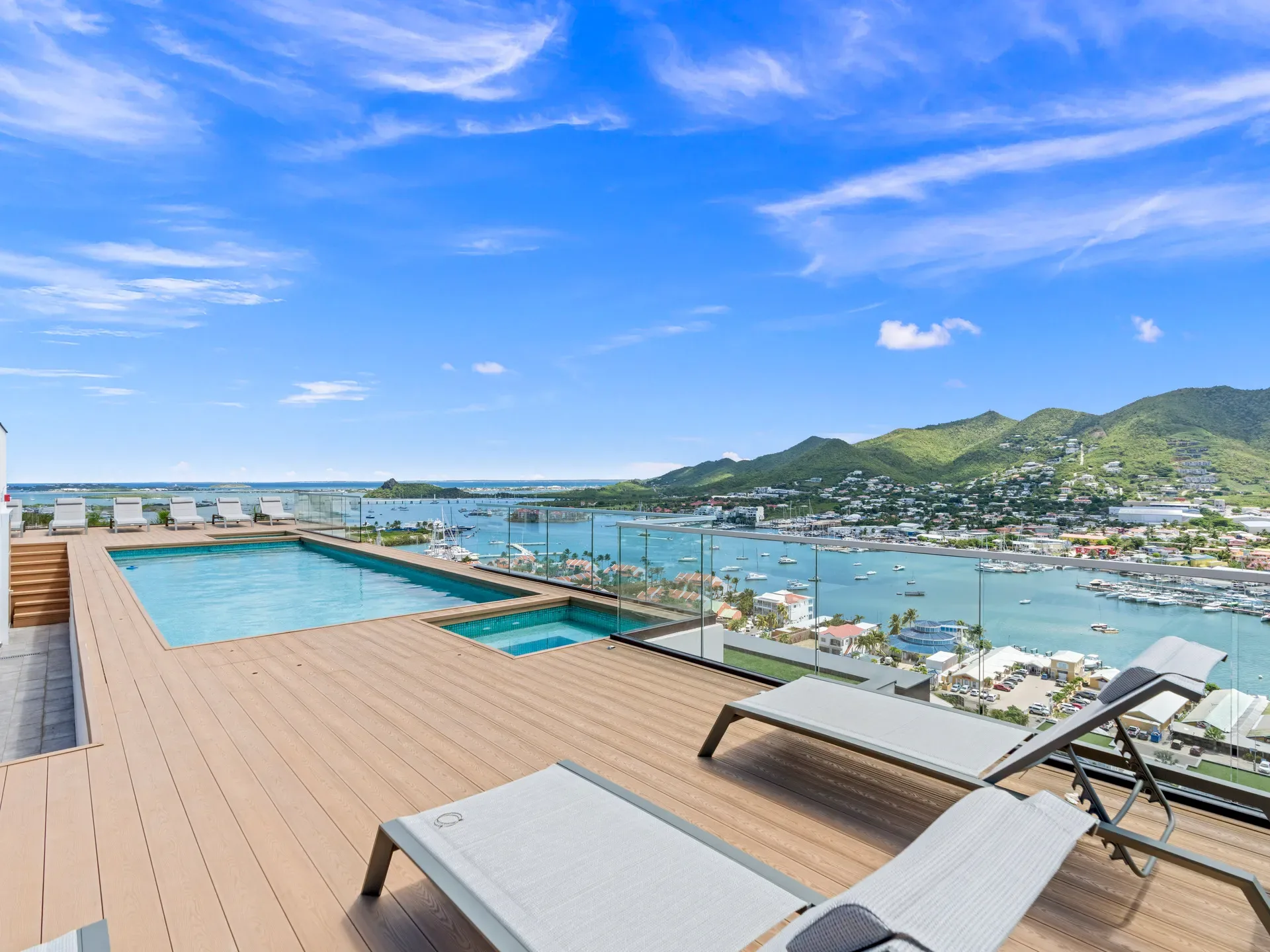 Experience the ultimate in convenience and luxury with this fully furnished, turnkey 1-bedroom condo located on the top floor of The Hills Residence in Simpson Bay, Sint Maarten. Spanning 57m², this property is perfectly situated in the heart of activities, offering easy access to beaches, dining, and entertainment. With a common rooftop featuring a pool and two jacuzzis, as well as private parking, this condo is an exceptional investment opportunity.